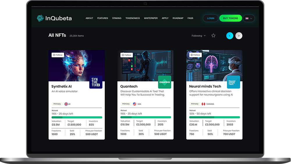 InQubeta's NFT marketplace enables AI start-ups to mint investment opportunities into NFTs, which can be listed on our platform for QUBE token holders to invest in. Each investment opportunity is divided into fractional NFTs, making it easy for investors to invest according to their budget. As projects grow and develop, investors can earn rewards and benefits through equity-based NFTs.